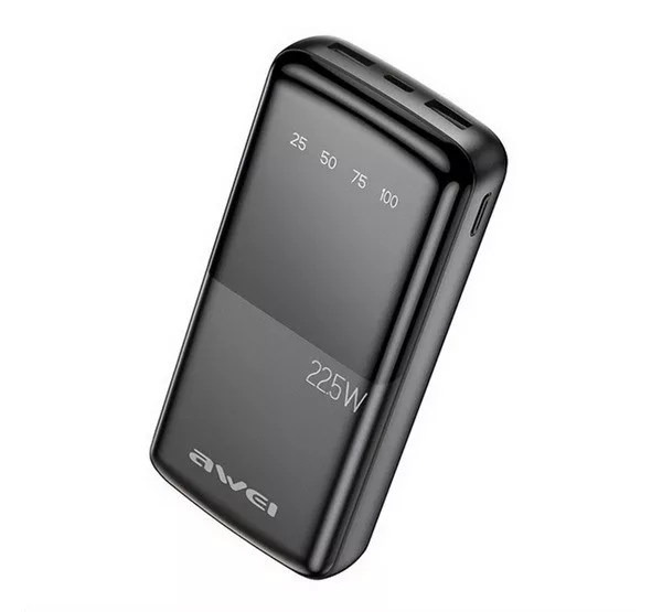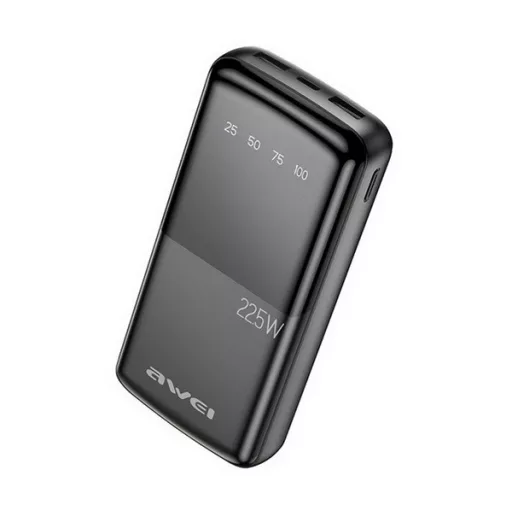AWEI P13K vésztöltő 2 USB+Type-C aljzat (20000mAh, 22.5W, PD gyorstöltő, LED kijelző) FEKETE