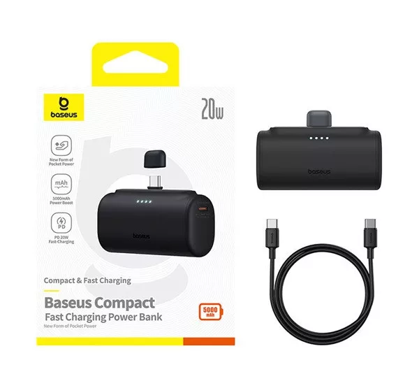 BASEUS COMPACT vésztöltő Type-C aljzat (5000mAh, 20W, PD gyorstöltő, Type-C csatlakozó + Type-C kábel) FEKETE