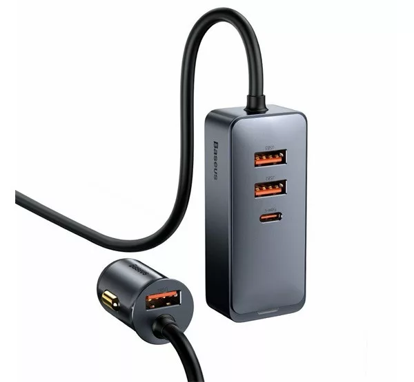 BASEUS autós töltő 3 USB+Type-C aljzat 120W, PD gyorstöltő + 1.5m hosszabbító, SZÜRKE