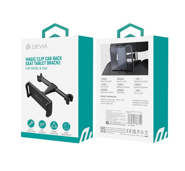 DEVIA MAGIC CLIP autós tartó (fejtámlára rögzíthető, 360°, állítható, 5-12" készülékhez) FEKETE