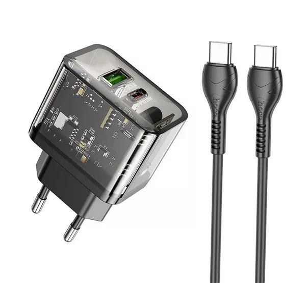 HOCO N34 hálózati töltő USB+Type-C aljzat 20W, PD gyorstöltő 3.0 + Type-C kábel, ÁTLÁTSZÓ