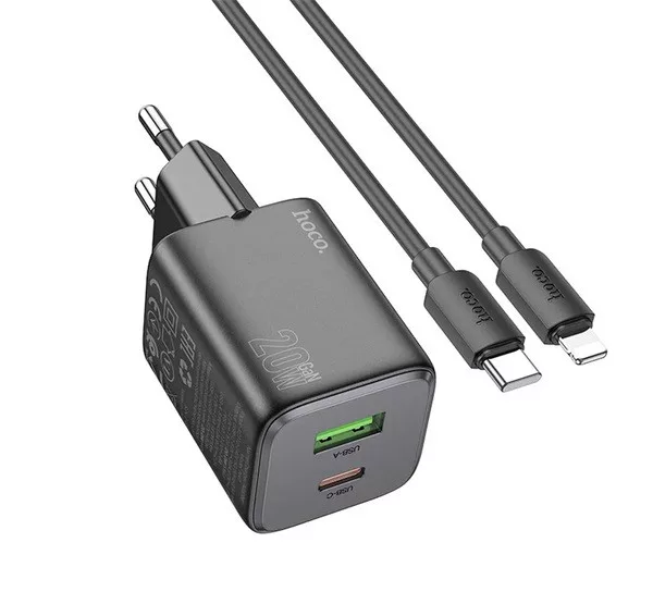 HOCO N41 hálózati töltő USB+Type-C aljzat 20W, PD gyorstöltő 3.0 + lightning kábel, FEKETE