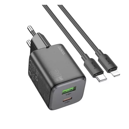 HOCO N41 hálózati töltő USB+Type-C aljzat (20W, GaN, PD gyorstöltő 3.0 + lightning kábel) FEKETE