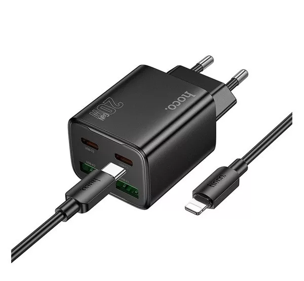 HOCO N55 hálózati töltő 2 USB+2 Type-C aljzat 20W, PD gyorstöltő 3.0 + lightning kábel, FEKETE