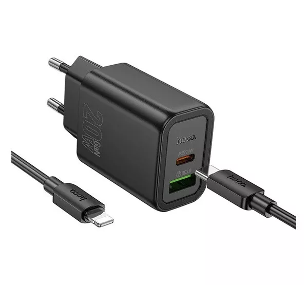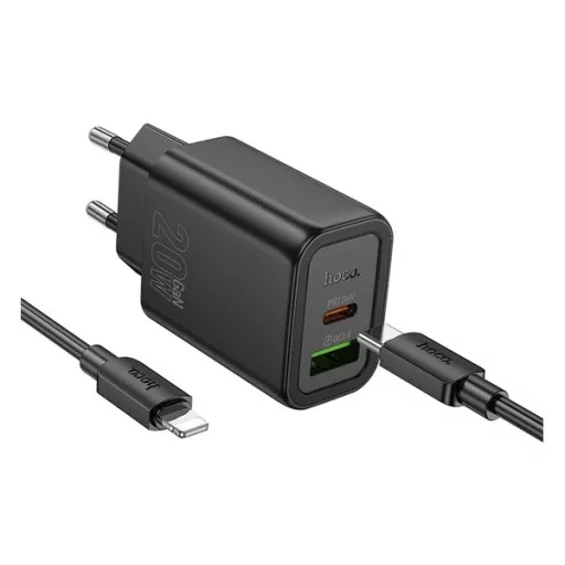HOCO N61 hálózati töltő USB+Type-C aljzat 20W, PD gyorstöltő 3.0 + lightning kábel, FEKETE
