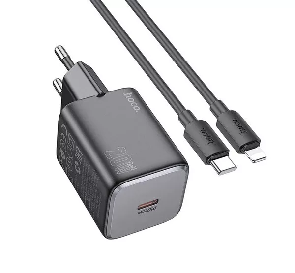 HOCO SPINNER hálózati töltő Type-C aljzat (20W, PD gyorstöltő 3.0 + lightning kábel) FEKETE
