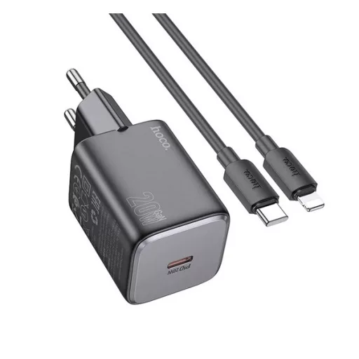 HOCO SPINNER hálózati töltő Type-C aljzat 20W, PD gyorstöltő 3.0 + lightning kábel, FEKETE