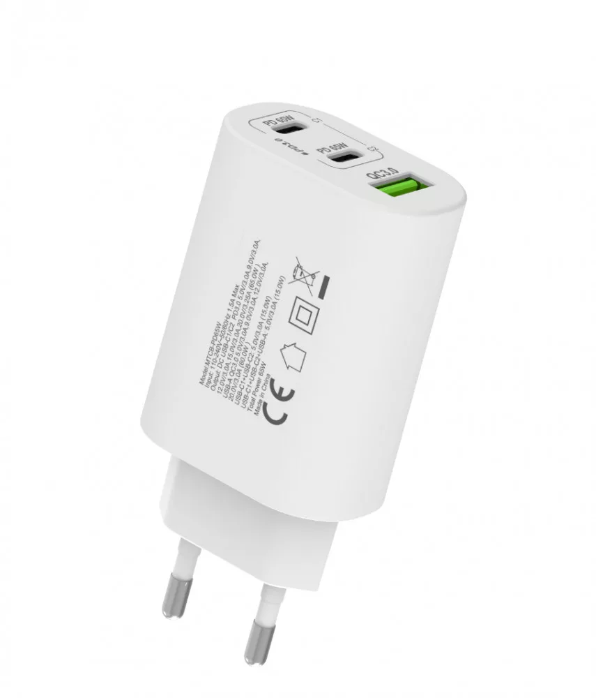 65 Wattos Gyorstöltő Hálózati Adapter USB A és 2db Type C Kimenettel Bemutatjuk a 65 wattos gyorstöltő hálózati adapterünket, amely optimális megoldást kínál a modern elektronikai eszközök hatékony és gyors töltésére. Ez a kompakt és stílusos adapter USB A és 2db Type C kimenetekkel rendelkezik, biztosítva a széles körű kompatibilitást a legkülönfélébb készülékekkel, az okostelefonoktól a táblagépekig. A beépített Quick Charge 3.0 technológia és a 65 wattos teljesítmény lehetővé teszi a villámgyors töltést, jelentősen csökkentve az eszközök töltéséhez szükséges időt, ezáltal növelve a felhasználó produktivitását és kényelmét. Az adapter tervezése során kiemelt figyelmet fordítottunk a praktikumra és az esztétikára. Letisztult vonalai és minimalista kialakítása révén zökkenőmentesen illeszkedik bármilyen környezetbe, legyen szó otthoni, irodai vagy utazási felhasználásról. A háromféle kimenet révén nincs szükség több különálló töltőre, ami hozzájárul a töltési megoldások egyszerűsítéséhez és az esztétikusabb környezet megteremtéséhez. Ez a gyorstöltő adapter nem csupán egy kiegészítő, hanem egy alapvető eszköz, amely a mai rohanó világban elengedhetetlen a zökkenőmentes digitális élményhez. Befektetés a hatékonyságba és a megbízhatóságba. Specifikációk: Bemeneti feszültség: AC 110-240V, 50/60HzKimenetek száma és típusa USB-C1: 5V/3A,9V/3A,12V/3A,15V/3A,20V/3.25A USB-C2: 5V/3A,9V/3A,12V/3A,15V/3A,20V/3.25A USB-A1: 5V/3A,9V/3A,12V/3A,20V/3A USB-C1+USB-C2: 45W+20W(65W) USB-C1+USB-A1: 45W+18W(63W) USB-C2+USB-A1: 5V/3A(15W) USB-C1+(USB-C2+USB-A1): 45W+15W(60W)