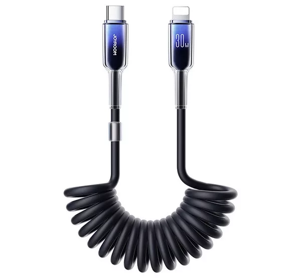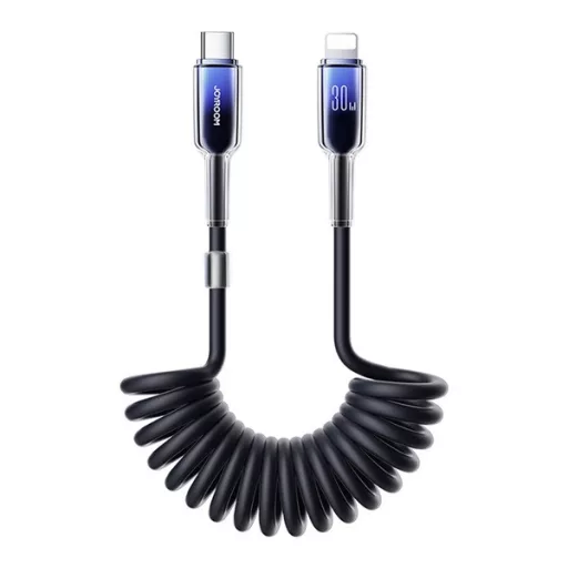 JOYROOM CRYSTAL CLEAR adatkábel (Type-C - lightning, 30W, 2A, PD gyorstöltő, spirálkábel, 150cm) FEKETE