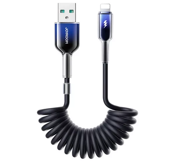 JOYROOM CRYSTAL-CLEAR adatkábel (USB - lightning, 3A, gyorstöltő, spirálkábel, 150cm) FEKETE