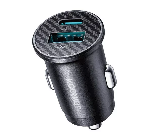 JOYROOM autós töltő USB+Type-C aljzat (15W, PD gyorstöltő, mini, karbon minta) FEKETE