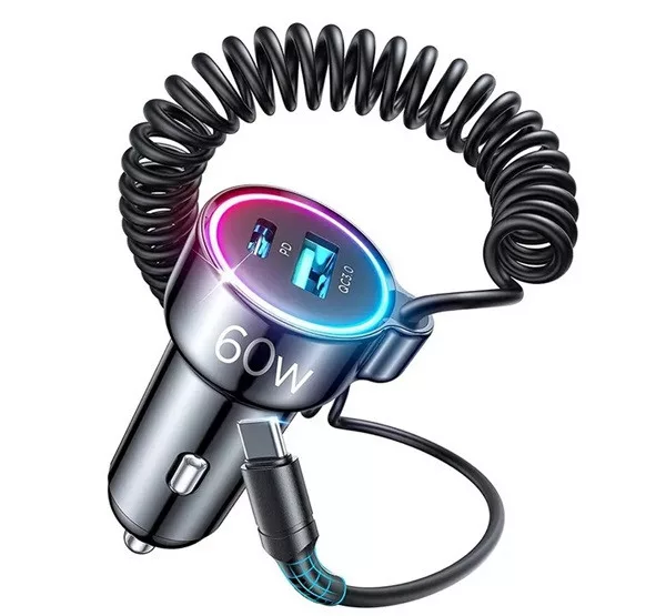 JOYROOM autós töltő USB+Type-C aljzat 55W, PD gyorstöltő 3.0 + fix Type-C kábel, FEKETE