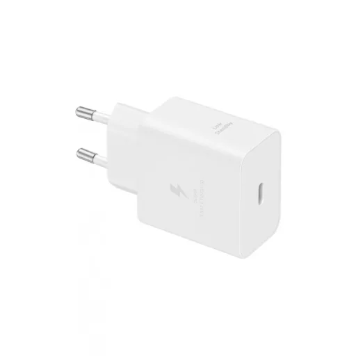 A töltő kompakt, fehér kialakítása elegánsan illeszkedik