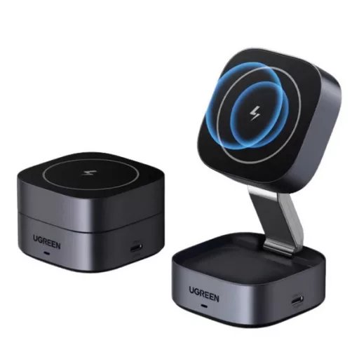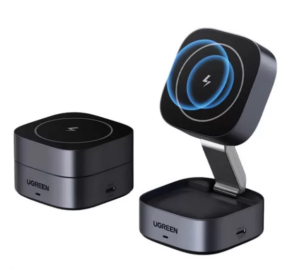 UGREEN W702 asztali töltő 2in1 (15W, gyorstöltő, wireless, MagSafe, Apple Airpods töltő, Qi2) SÖTÉTSZÜRKE
