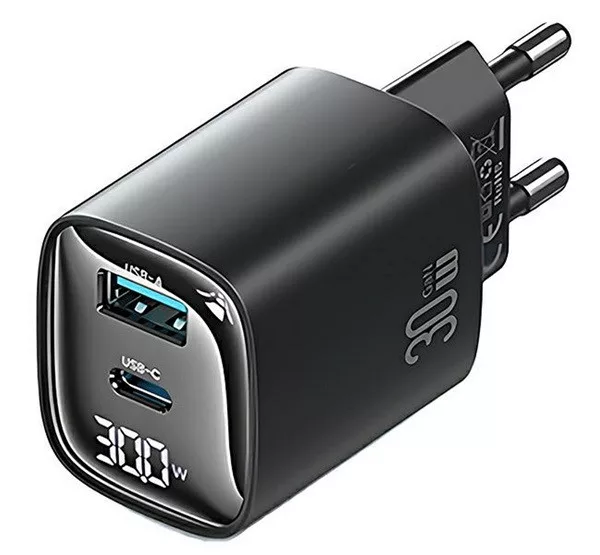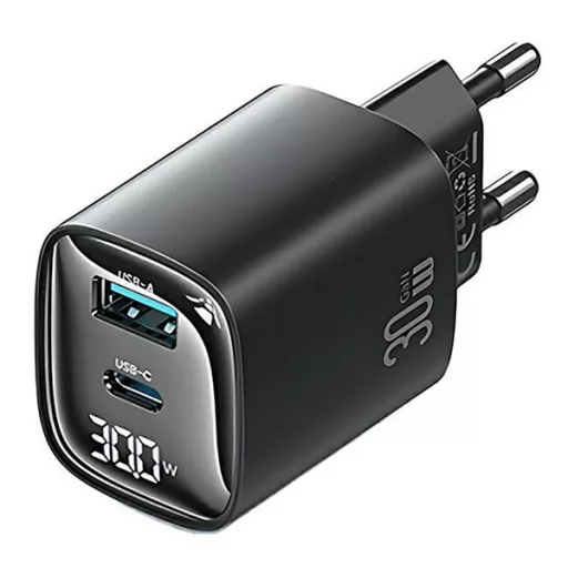 USAMS CC229 hálózati töltő USB+Type-C aljzat (30W, GaN, PD gyorstöltő, LED kijelző) FEKETE