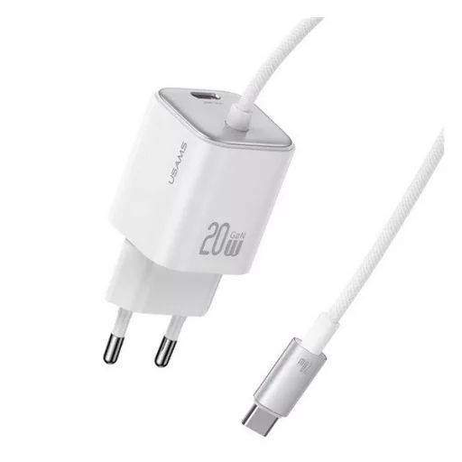 USAMS JC MINI hálózati töltő Type-C aljzat 20W, GaN + fix Type-C kábel, FEHÉR