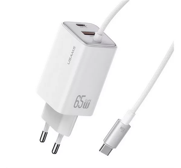 USAMS JC hálózati töltő Type-C aljzat 66W, GaN + fix Type-C kábel, FEHÉR