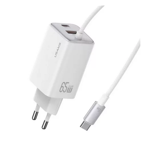 USAMS JC hálózati töltő Type-C aljzat (66W, PD gyorstöltő, GaN + fix Type-C kábel) FEHÉR