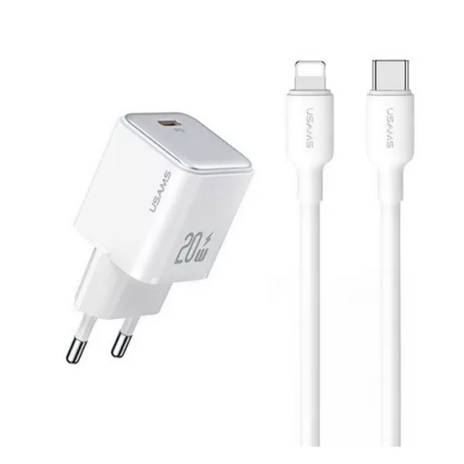 USAMS hálózati töltő Type-C aljzat (20W, PD gyorstöltő 3.0 + Type-C - lightning kábel) FEHÉR