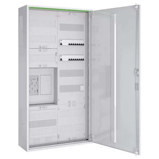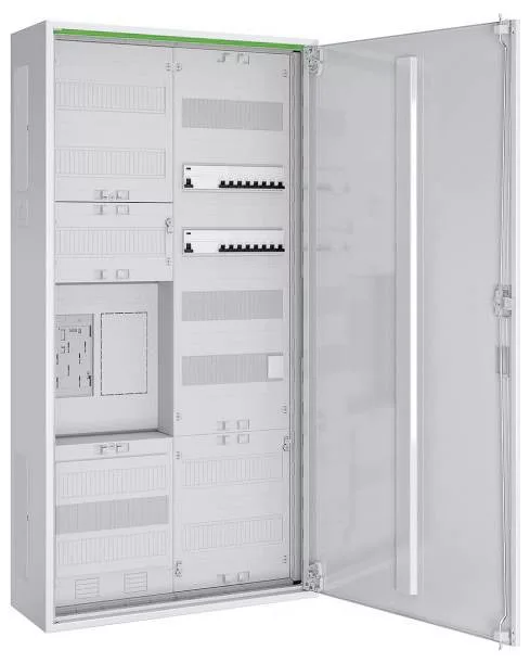 Komplett szekrény, amely a következőket tartalmazza: 1x eHZ kazetta, 5 pólusú fővezeték-elágazó sorkapoccsal bekötve, 5 pólusú gyűjtősínrendszer, 5x 16 mm²-es csatlakozókapocs, 1x tartalék mérőhely, 1x 5 soros elosztótábla APZ rekesszel RJ45 interfésszel, vezetékezés nélkül, 1x szerelőcsomag, amely a következőket tartalmazza: 16x LS B16 A, 2x RCD 30 mA és 1x csengőtranszformátor 1 A/8(12) V Gyártó: Schneider Electric
