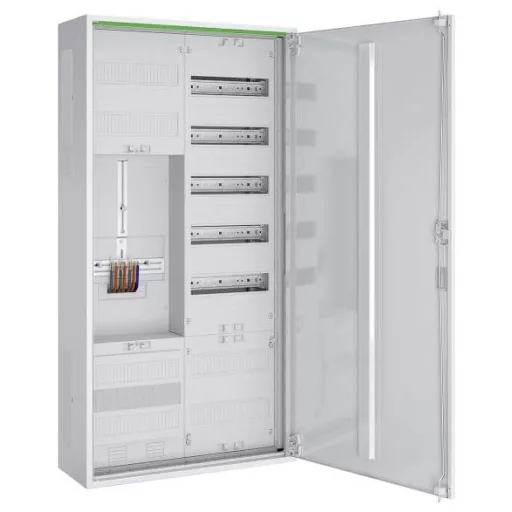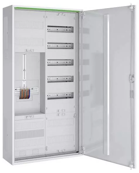 Komplett szekrény, amely a következőket tartalmazza: 1x 3-pontos mérőtábla zárható főkapcsolóval bekötve, 5 pólusú sínrendszer, 5x 16 mm²-es csatlakozókapcsok, nincs mérőhely-tartalék, 1x 5 soros elosztótábla APZ rekesszel, RJ45 interfésszel együtt