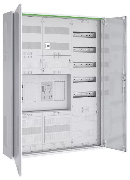 Komplett szekrény, amely a következőket tartalmazza: 2x eHZ kazetta OKK-val és zárható főkapcsolóval bekötve, 5 pólusú sínrendszer, 5x 16 mm²-es csatlakozókapcsok, 2x mérőtartalék hely, 1x 5 soros elosztópanel APZ hellyel, RJ45 interfésszel együtt