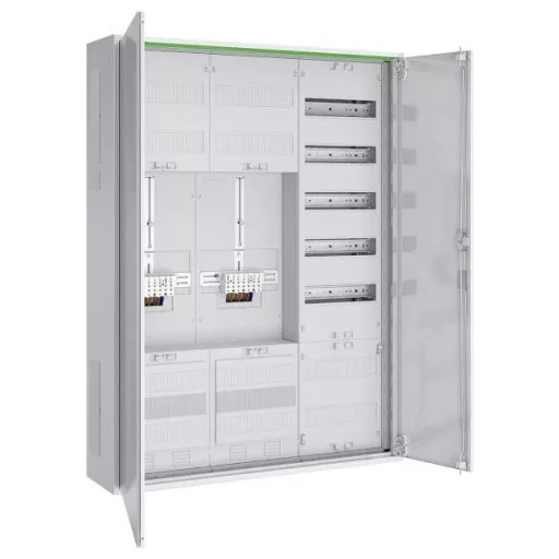 Komplett szekrény, amely a következőket tartalmazza: 2x 3-pontos mérőhely, 5 pólusú fővezetéki leágazó sorkapoccsal és mérődugaszolható sorkapcsokkal bekötve, 5 pólusú gyűjtősínrendszer, 5x 16 mm²-es csatlakozósorkapcsok, nincs mérőhely-tartalék, 1x 5 soros elosztópanel APZ hellyel, RJ45 interfésszel együtt