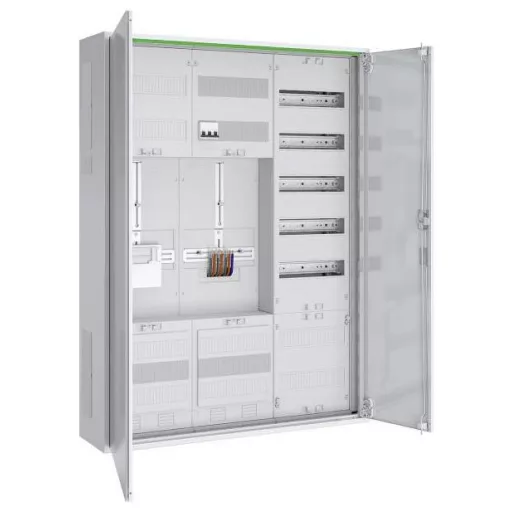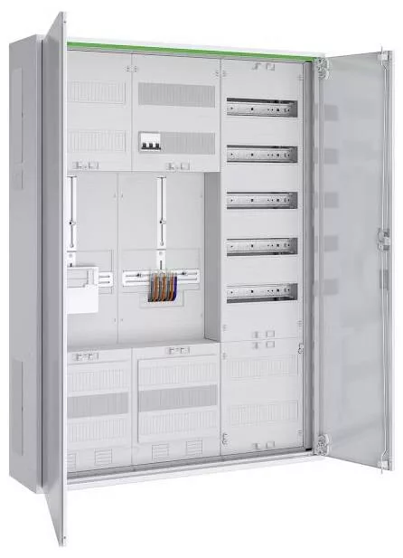 Komplett szekrény, amely a következőket tartalmazza: 1x 3-pontos mérőtábla főkapcsolóval bekötve, 5 pólusú sínrendszer, 5x 16 mm² csatlakozókapcsok, 1x tartalék mérőtábla, 1x 5 soros elosztótábla APZ rekesszel, RJ45 interfésszel