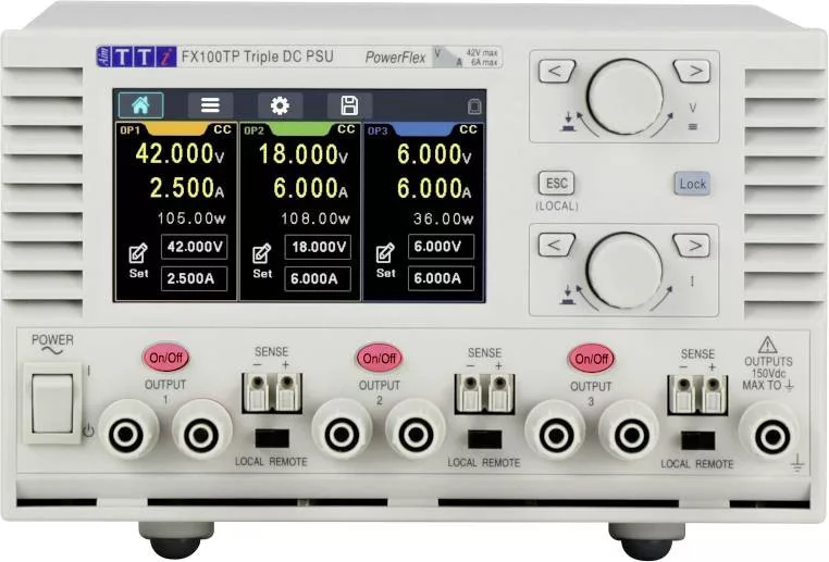 Aim TTi FX100TP Labortápegység, szabályozható 0 - 42 V 1 mA - 6 A 246 W Távirányítható,OVP,Vékony kivitel Kimenetek száma 3 x