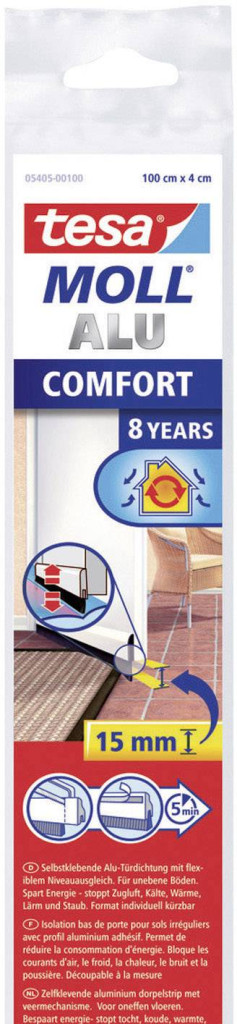 A hosszú életű, öntapadó Tesamoll® ajtószigetelő léc véd a huzattól, hidegtől, portól és zajtól. Aktív szintkiegyenlítés a rugós kefe függöny segítségével, csempéhez, járólaphoz és más egyenletlen padlóhoz. A jó minőségű sörték tökéletes szigetelést biztosítanak.