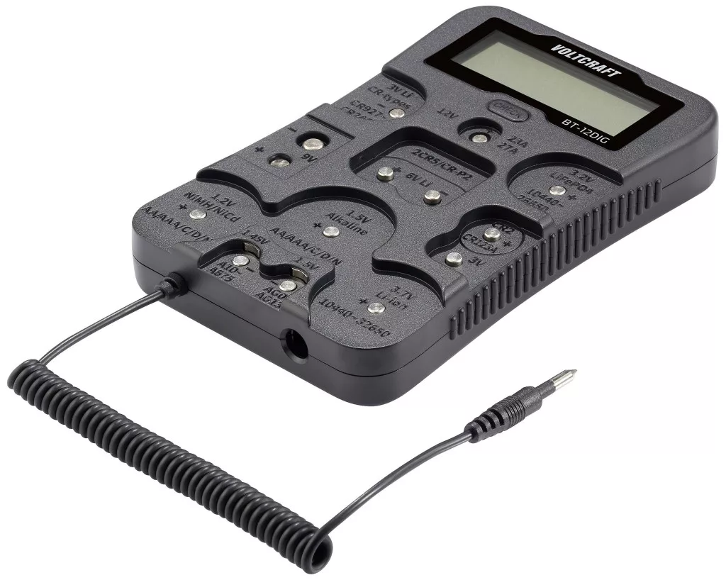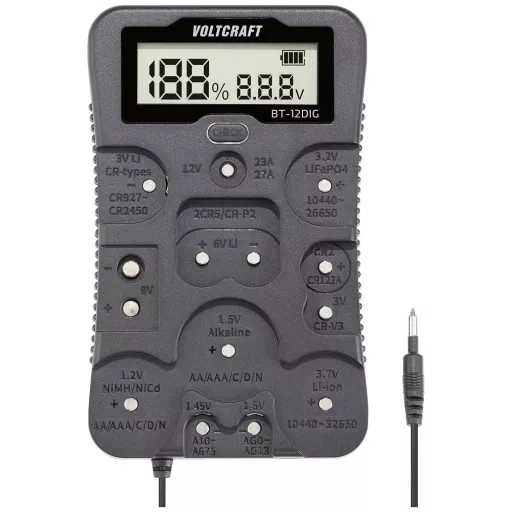 Sokoldalú és áttekinthetőA Voltcraft BT-12DIG akkumulátor- és újratölthető akkumulátor-teszter áttekinthetővé teszi a méréseket: Minden elterjedt formátum és típus, a gombelemektől a 9 V-os blokkokig, a Ni-MH/Cd-tól a LiFePO4 akkumulátorokig, töltési szintje 1,2 és 12 V közötti mérési tartományban ellenőrizhető. Még a hallókészülékek, a digitális és az eldobható elemek is tesztelhetők, hogy megvédjék magukat a kellemetlen meglepetésektől. A Voltcraft BT-12DIG automatikusan felismeri az adott akkumulátortípust, és a feszültséget és a kapacitást százalékban jeleníti meg a nagyméretű, könnyen leolvasható LC kijelzőn.