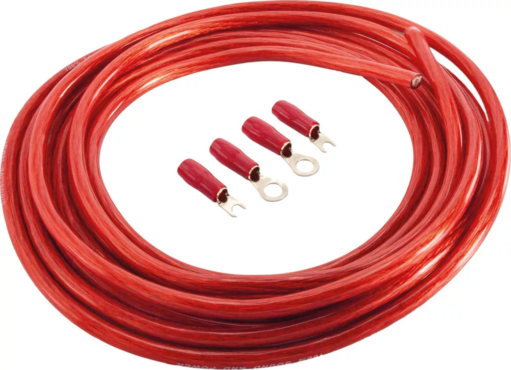 Akkumulátor kábelkészletek 2 gyűrűs kábelsaru és 2 villás kábel dugaszoló, a gépkocsiban az egyszerű szereléshez. Ahhoz, hogy mindig elegendő áram álljon a végfokozat rendelkezésére bőségesen méretezett kábelek kell rendelkezésre álljanak.