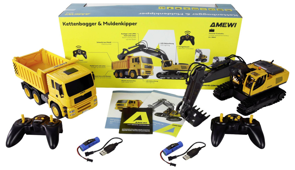 Ez az átfogó építőipari felszerelés készlet tartalmaz egy távirányítású lánctalpas kotrógépet és egy távirányítású dömpert, így dupla szórakozást kínál a 6 éves vagy annál idősebb gyermekek számára. Mindkét jármű az RTR (Ready-to-Run) készlet része, és két távirányítóval, két elemmel és két USB töltőkábellel érkezik, így azonnal elkezdheted a játékot – ideális barátokkal vagy testvérekkel való közös játékhoz. A távirányítású lánctalpas kotrógép számos valósághű funkcióval lenyűgöző. Előre és hátra is tud mozogni, balra és jobbra kormányozható, a felső kocsi 350 fokban elforgatható, a gém és a kanál pedig együtt mozgatható. Egy masszív fémből készült ásó lehetővé teszi apró anyagok emelését és mozgatását. A gumis lánctalpak jó tapadást biztosítanak különböző felületeken, míg a bekapcsolható LED-világítás és a demó funkció tovább növeli a játék értékét. A készletben található 1:18 méretarányú dömper izgalmas játékfunkciókat és gyermekbarát dizájnt kínál feltűnő sárga és fekete színben. Minden irányba kormányozható, és egy billenő vályúval rendelkezik, amely távirányítóval emelhető és süllyeszthető – tökéletes építőanyagok szállításához. A gumiabroncsok biztos tapadást biztosítanak, az első kerekek manuális trimmelése pedig precíz kormányzást tesz lehetővé. A dömper LED-es világítással is fel van szerelve. Mindkét jármű interferenciamentes 2,4 GHz-es rádiórendszert használ, amely lehetővé teszi több modell egyidejű működését jelzavarok nélkül. A járművenként akár 20 perces vezetési idővel és az akkumulátorok kényelmes USB-kábellel történő töltésének lehetőségével a hosszan tartó szórakozás garantált. Ez a készlet a robusztus technológiát a könnyű kezelhetőséggel ötvözi, és realisztikus, sokoldalú játékélményt kínál a fiatal építkezési rajongók számára.