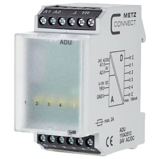 Az ADU-C12 analóg-digitális átalakító 0-7,5 V DC bemeneti feszültségeket dolgoz fel 0,5 V-os lépésekben. A digitális kimenetek az alkalmazott bemeneti feszültségnek megfelelően kapcsolnak. A kimenetek 1,5 másodpercenként frissülnek, és a kapcsolási állapotot LED jelzi. Csatlakozás csavaros kapcsokkal, kapcsolási állapot kijelzés LED-ekkel.