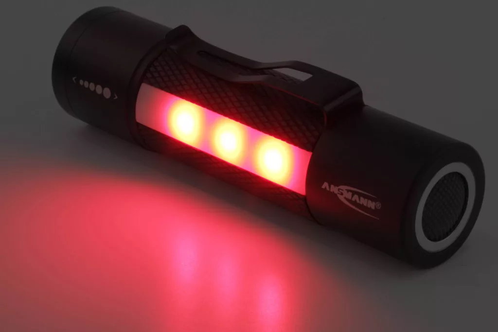 Jellemzők: 3 W elülső Toshiba LED · Oldalsó munkalámpa fehér és piros SMD LED-ekkel · Munkafény villogó fény funkcióval · Fókuszálható · Robusztus alumínium ház · Vég sapka kapcsoló · Csúszásmentes felület · Integrált tartómágnes · Fröccsenésmentes