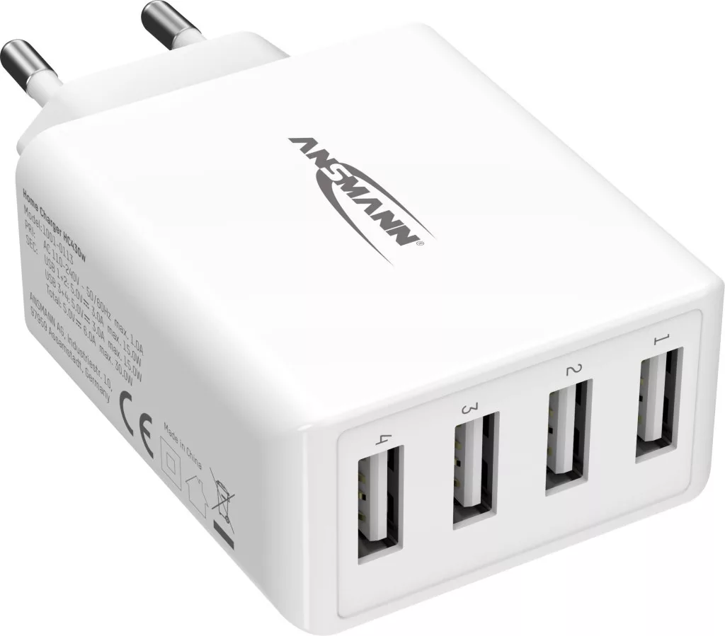 Műszaki adatok: Alkalmas: iPhone, iPad, Smartphone, Tablet, AirPods · Alkalmazás helye: Beltér · Bemenetek (dugótípus): Euro dugó · Bemeneti feszültség (num): 230 V/AC · Bemeneti feszültség tartomány: 100 - 240 V · ErP státusz: Level VI · Gyártói szín: Fehér · Kimenetek: 4 x USB-A · Kimenetek száma: 4 x · Kimeneti feszültség: 5 V/DC · Kimeneti áram (max.): 6000 mA · Méret, hossz: 94.1 mm · Méret, magasság: 24.3 mm · Méret, szélesség: 51 mm · Súly: 82 g · Teljesítmény: 30 W