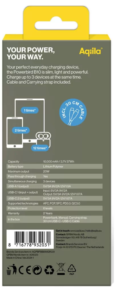 Győződjön meg arról, hogy okostelefonja vagy más mobil USB-eszköze soha nem marad áram nélkül az Aqiila PowerBank segítségével. Az átlátszó LCD-kijelző pontosan mutatja, hogy mennyi energiája van még hátra. 10 000 mAh kapacitásával és kompakt kialakításával ez a PowerBank tökéletes egyensúlyt kínál a hordozhatóság és a teljesítmény között. Töltse fel okostelefonját többször, ideális utazáshoz, napi ingázáshoz vagy csak egy eseménydús naphoz. A puha tapintású felület és a praktikus hordszíj biztonságos fogást és stílusos megjelenést biztosít, míg a könnyű és kompakt formátum biztosítja, hogy a PowerBank könnyen elférjen a zsebében, ideális útközben! Ezenkívül az Aqiila PowerBank két USB-C és egy USB-A porttal rendelkezik, amelyek lehetővé teszik több eszköz egyidejű töltését. A 20 W-os maximális kimeneti teljesítménnyel készülékei pillanatok alatt újra megtelnek. A pass-through technológiának köszönhetően úgy töltheti készülékeit, hogy közben maga a PowerBank is töltődik. Hat beépített biztonsági funkciójával ez a PowerBank megbízható védelmet nyújt utazásai során, így nyugodt szívvel viheti magával a repülőgépre.
