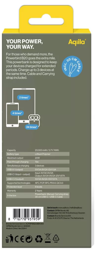 Az Aqiila PowerBank segítségével mindig elegendő energiát biztosít. 20 000 mAh kapacitásával ez a PowerBank tökéletes eszközök, például okostelefonok és táblagépek többszöri töltésére. Ideális hosszú utakhoz, kempingezéshez vagy olyan helyzetekhez, ahol hosszú ideig nem jut áramhoz. A puha tapintású felület és a praktikus hordozópánt biztonságos fogást és stílusos megjelenést biztosít. A PowerBank nagy energiatartalékot kínál kompakt formátumban, ideális utazók számára! Ezenkívül az Aqiila PowerBank két USB-C és egy USB-A porttal rendelkezik, amelyek lehetővé teszik több eszköz egyidejű töltését. A 20 W-os maximális kimeneti teljesítménynek köszönhetően készülékei nagyon gyorsan újra teljesen feltöltődnek. A pass-through technológiának köszönhetően úgy töltheti készülékeit, hogy közben maga a PowerBank is töltődik. Hat beépített biztonsági funkciójával ez a PowerBank megbízható védelmet nyújt utazásai során, így nyugodt szívvel viheti magával a repülőgépre.