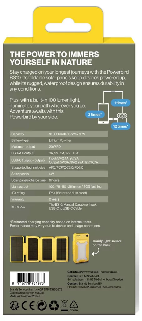 Package contents: Aqiila Powerbird BS10 napelemes bank,Karabiner akasztó,USB-C kábel 30 cm,Használati útmutató