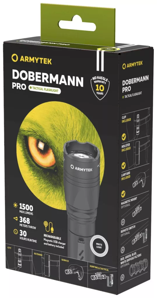 Az 1400 lumen fényerősségű lámpa közepes 100-200 méteres távolságokra (maximális fénytartomány 363 méter) alkalmas. A Doberman Pro magával vihető a természetbe vagy hosszabb utakra. Mint a frissített taktikai termékcsalád minden modellje, ez is egy használatra kész, csúcstechnológiás fejlesztés, akkumulátorral és mágneses kábellel, bármilyen USB áramforrásról tölthető.