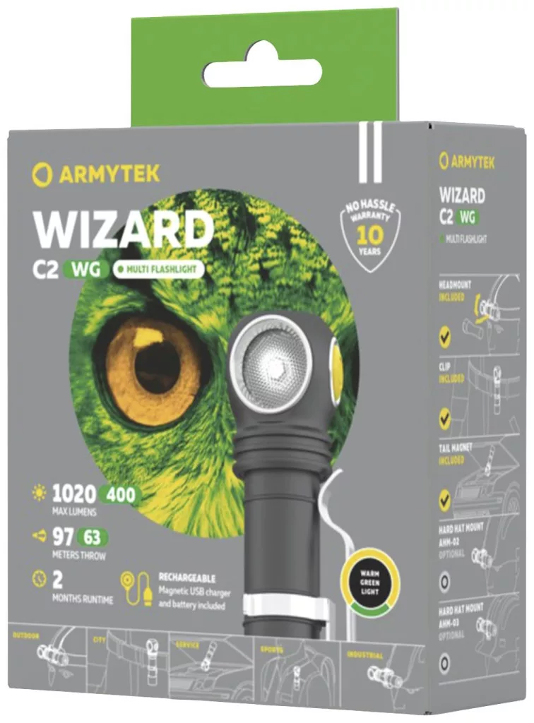 A Wizard C2 WG egy többfunkciós fő vagy kiegészítő fényforrás bármilyen tevékenységhez. A kiegészítő zöld kimenetnek köszönhetően a modell ideális az éjszakai látás fenntartásához a világítás váltakozó fel- és kikapcsolásakor: kempingsátorban, térképek olvasásához terepen navigálva, horgászfelszerelés előkészítésekor, valamint professzionális használat során. Csakúgy, mint a piros, a zöld változat is hatékony ködben és egyéb korlátozott látási viszonyok között, és kényelmes hosszú távú használatra.