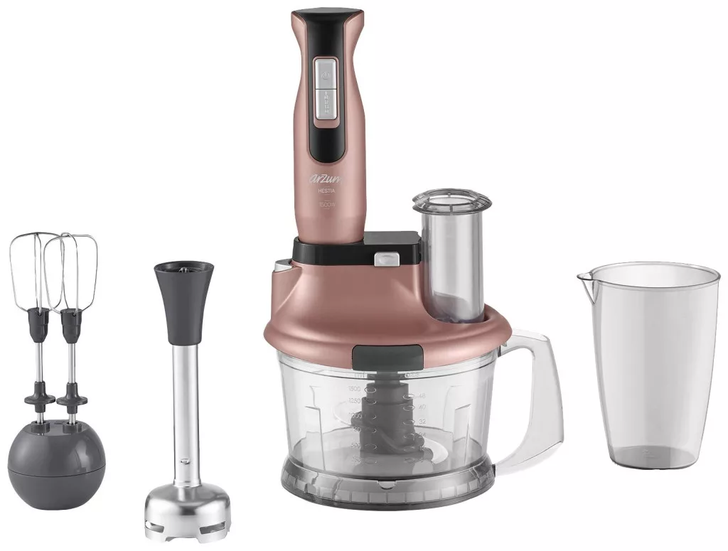 Műszaki adatok: Anyag: Nemesacél, Műanyag · Gyártói szín: Rozé arany · Konyhagép jellemzők: Turbó funkció, Jégtörő funkcióval, Mérőpohárral, Keverőpohárral · Teljesítmény: 1500 W