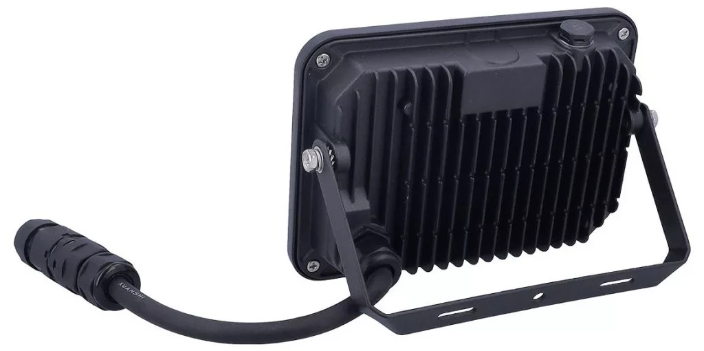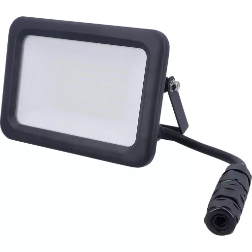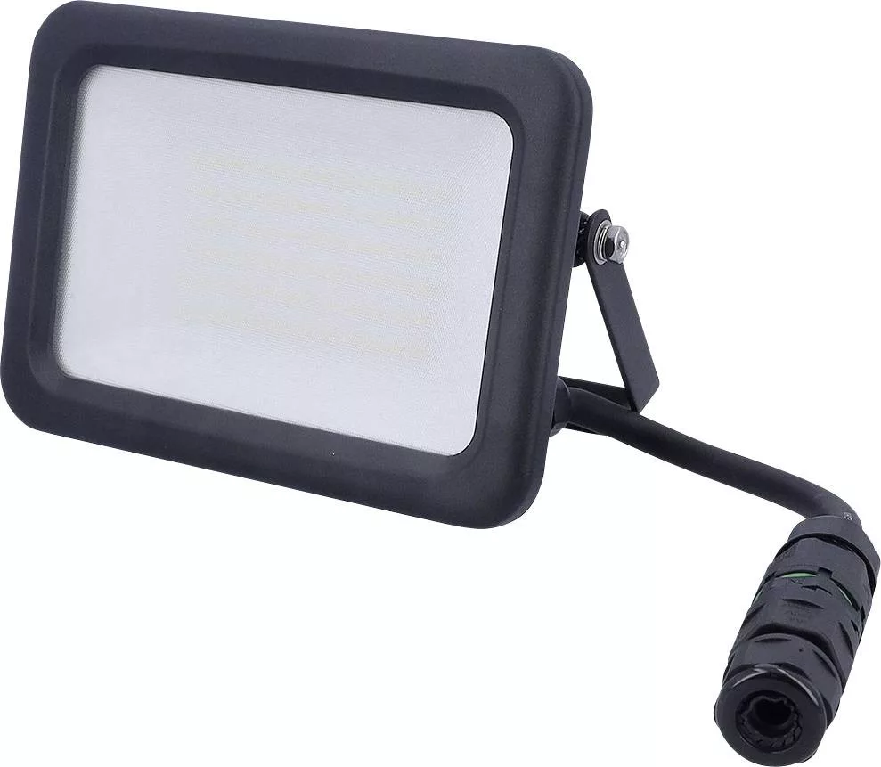 Erős, 50 W-os LED reflektor, körülbelül 6000 lumen semleges fehér fénnyel (4000 K). Robusztus műanyag házzal, alumínium hűtőfelülettel, nyomáskiegyenlítő elemmel és szatén felületű burkolattal felszerelve. Az IP65-ös védelemnek és a gyorscsatlakozós adaptereknek köszönhetően ideális állandó kültéri alkalmazásokhoz. A LED panel szükség esetén cserélhető.