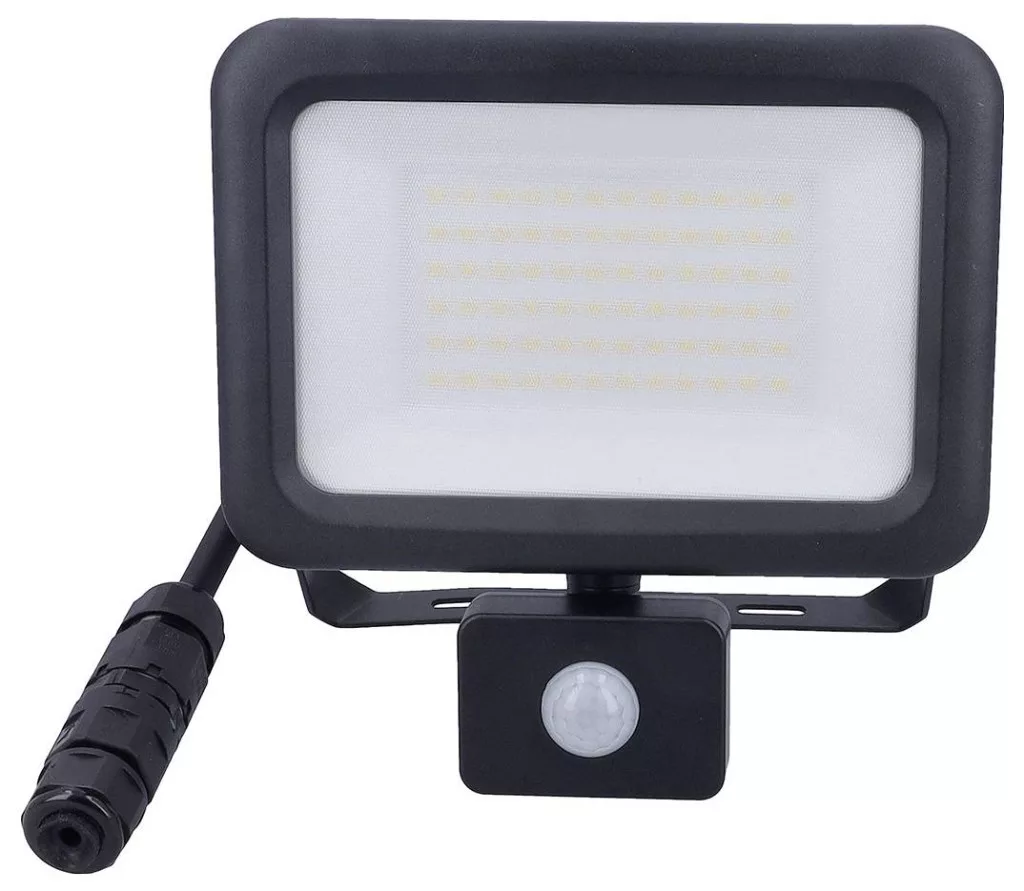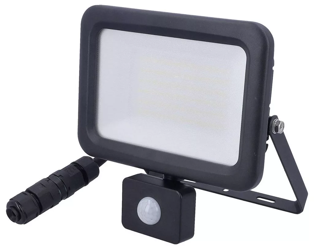 Erős, 50 W-os LED reflektor mozgásérzékelővel és kb. 6000 lumen fényerővel (4000 K, semleges fehér). Robusztus műanyag ház alumínium hűtőlemezzel és nyomáskiegyenlítő elemmel a páralecsapódás megakadályozása érdekében. Cseppálló (IP44), szatén diffúzorral, állítható érzékelővel (10 s–10 perc / 3–10000 Lux / 4–10 m) és gyorscsatlakozó adapterrel. Ideális kültéri használatra.