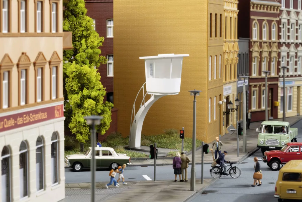 Az 1960-as években gyorsan növekvő tömeges motorizáció megbízható forgalomfigyelést és -szabályozást igényelt a nagyvárosok kritikus forgalmi csomópontjain. Az ilyen tornyokat a forgalom figyelésére és irányítására használták. Modellünk alapján a villamos-, trolibusz- és személygépkocsi-forgalom jelzőlámpás rendszereinek vezérlésébe szükség szerint manuálisan is be lehetett avatkozni. Műszaki meghibásodás esetén a forgalomirányítást hagyományos módon egy közlekedési rendőr végezte a kereszteződés közepén lévő peronon. Mindkét forgatókönyv újraalkotható egymáshoz illő, mellékelt, festetlen figurákkal.