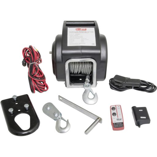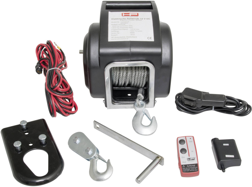 Jellemzők: Biztosíték 25 A · Ideális autóba, hajóra és szabadidős tevékenységekhez · Vezetékes és vezeték nélküli távirányítóval · Elektromos előre- és hátramenet, nem lehetséges üresjárat · Adapter lemezzel, a vonóhorogra akasztáshoz vagy fix rögzítéshez · Az autó akkura szükséges csatlakoztatni · Guruló húzóteljesítmény: 6800 kg - vezetőgörgővel 13600 kg · A húzóerő adatok talajtól és emelkedőtől függően változnak · Vontatókötél hossza: 12 m - 7,2 mm Ø · Teljesítmény: 260 W · 25 A-es biztosíték szükséges