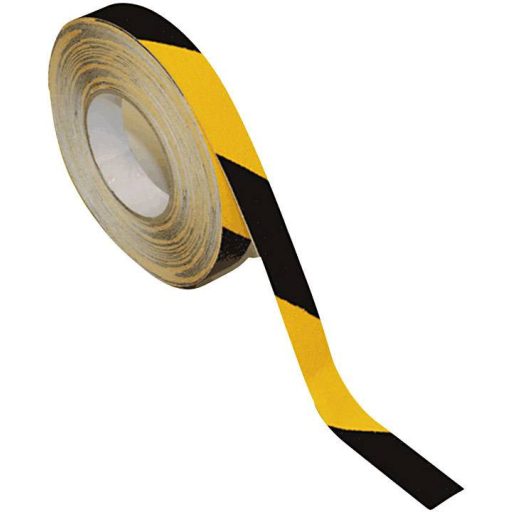 Univerzális csúszásgátló tekercs, 18,3 méter hosszú, figyelmeztető jelölés sárga / fekete, szélessége 25 mm, az ASR A1.5 / 1, 2 R13 szerint, kültéri és beltéri használatra, ásványi szemcsés PVC, UV-álló, könnyen telepíthető. Öntapadó.