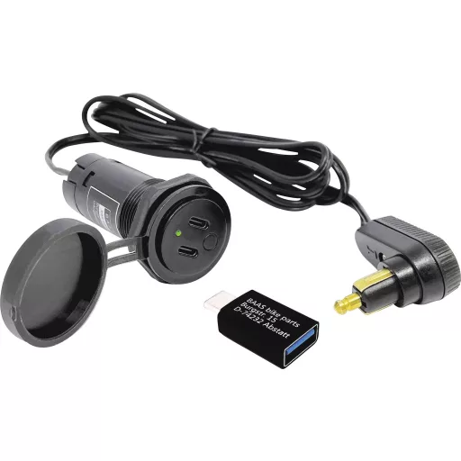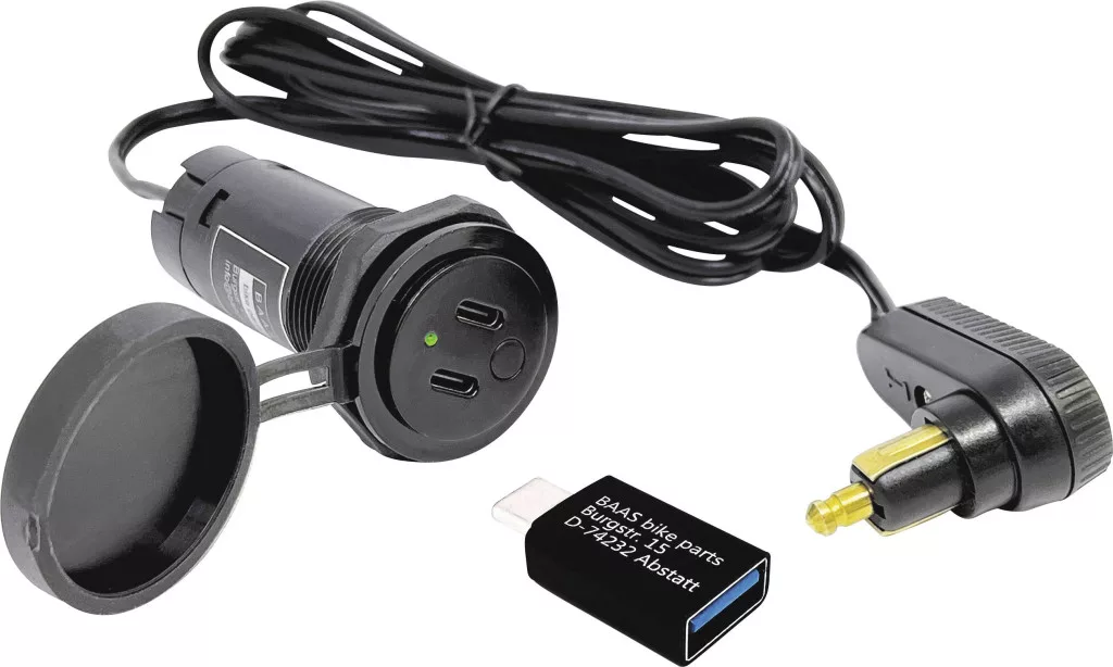 A tanktáska kábele egy kis DIN fedélzeti aljzatba csatlakozik a szögletes csatlakozó segítségével, és 2 USB-eszközt biztosít áramellátással 1 méter távolságban. Kikapcsolás után nincs folyamatos áramfogyasztás.