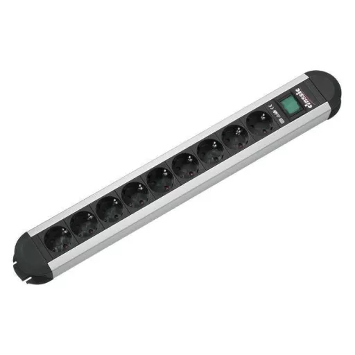 Műszaki adatok: Alkalmazás helye: Beltér · Anyag: Alumínium · Csatlakozási teljesítmény: 3680 W W · Dugaljak száma: 9 · Gyártói szín: Alumínium, Fekete · Hálózati csatlakozó típus: Védőérintkezős · Hálózati elosztó jellemzők: Gyermekvédelem, Kapcsolóval · Kábel típus DIN/VDE szerint: H05VV-F 3G 1,5 mm² · Kábelhossz: 1.75 m · Méret, hossz: 71 mm · Méret, magasság: 54 mm · Méret, szélesség: 560 mm · Szerelési mód: Szerelési lyukak · Védelmi típus: IP20 · Üzemi feszültség: 250 V