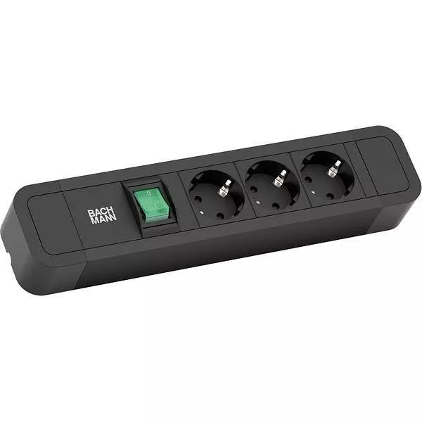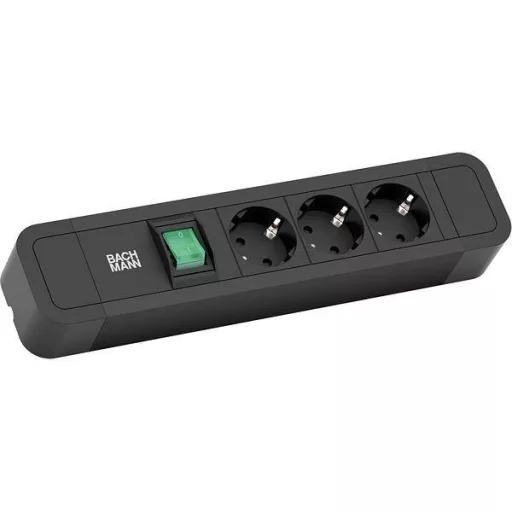 PRIMO 2 elosztó alumínium feketére eloxált Fekete kivitelű végzárók 3x védőérintkezős aljzatok 35° fekete 1x zöld kapcsoló Tápkábel: 2,0 m H05VV-F 3G 1,5 mm² fekete védőérintkezős ferde dugóval dobozba csomagolva